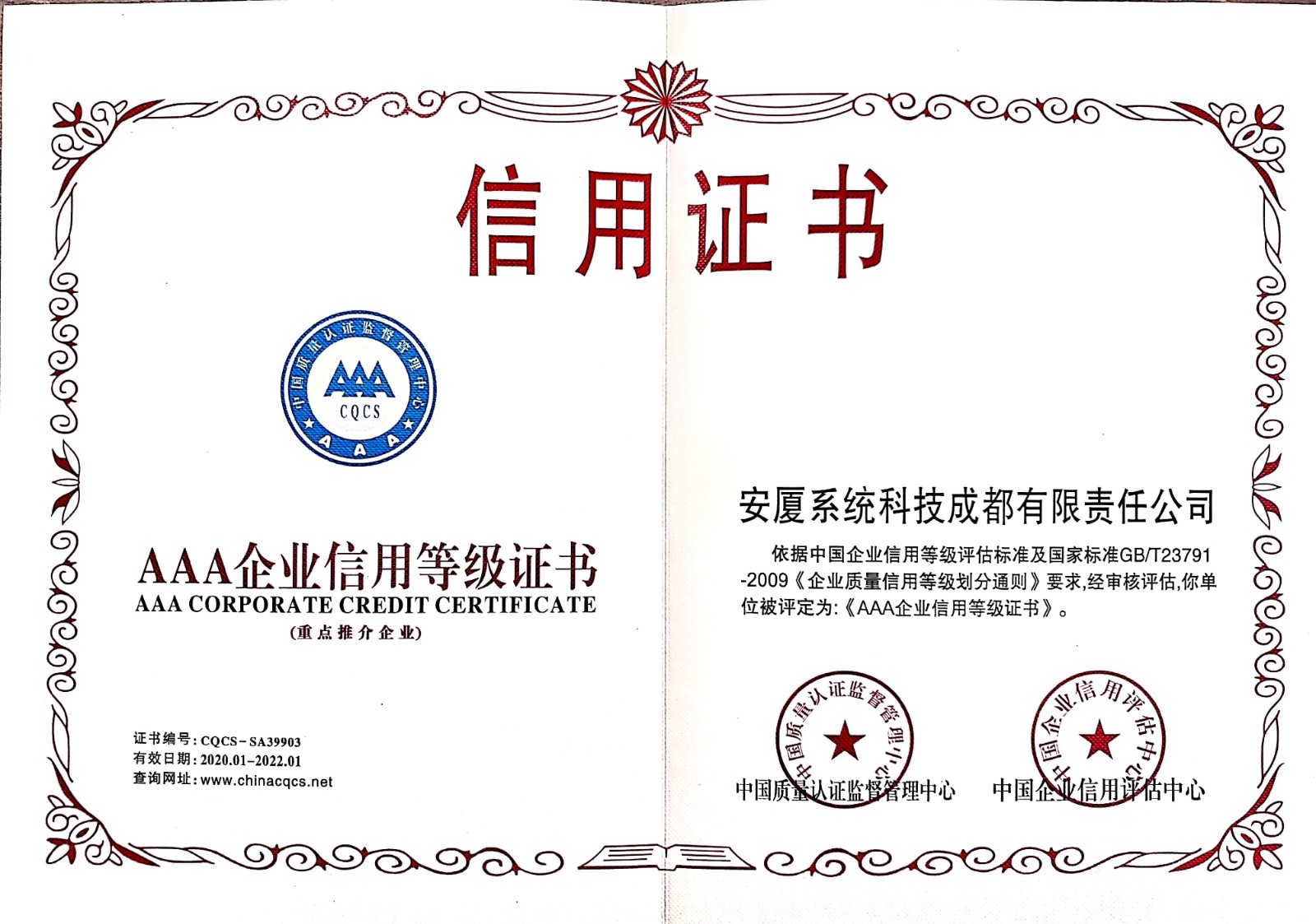 • 3A企業(yè)等級(jí)認(rèn)證證書