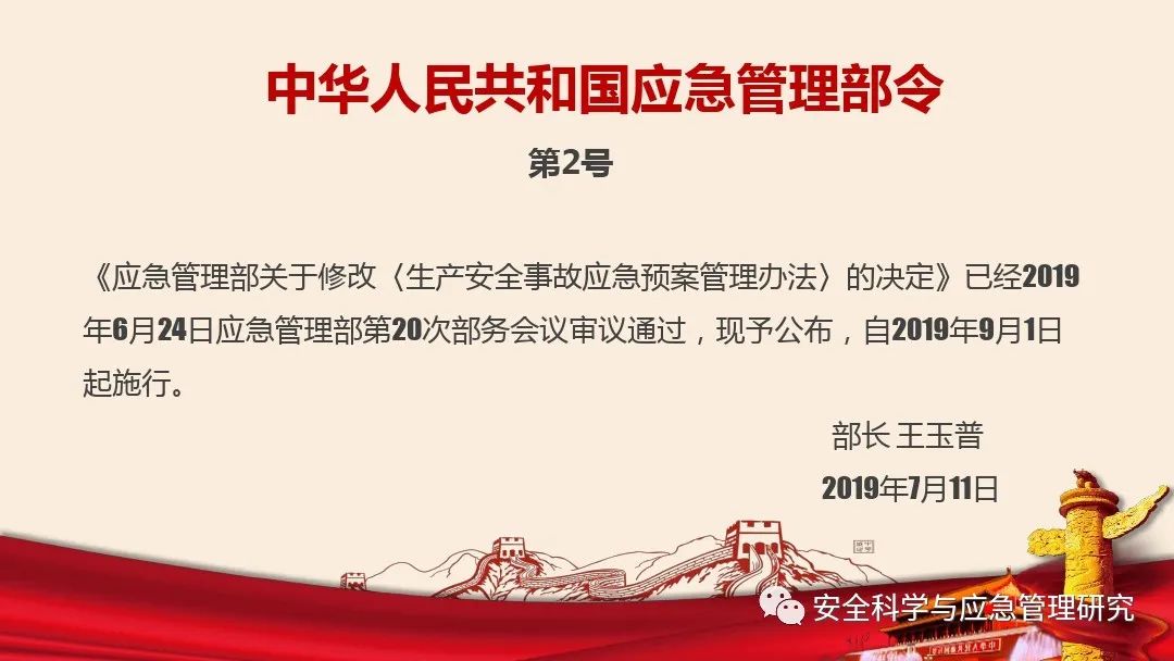 中華人民共和國應急管理部令第2號發(fā)布,內容是關于修改原安全監(jiān)管總局88號令《生產安全事故應急預案管理辦法》,一共涉及19條修改,同時將修改后的文本正式發(fā)布!