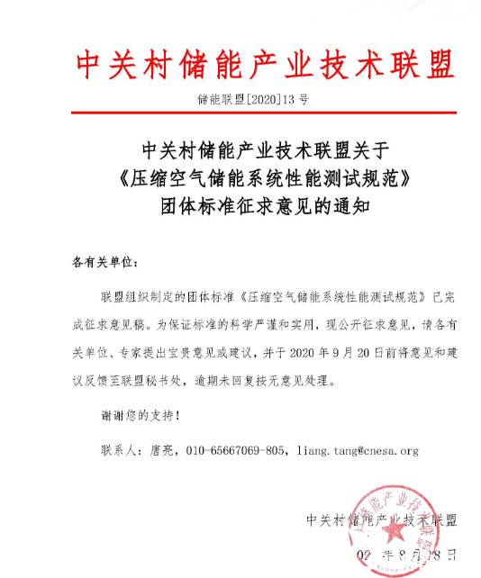中關(guān)村儲能產(chǎn)業(yè)技術(shù)聯(lián)盟關(guān)于《壓縮空氣儲能系統(tǒng)性能測試規(guī)范》團體標(biāo)準(zhǔn)征求意見的通知