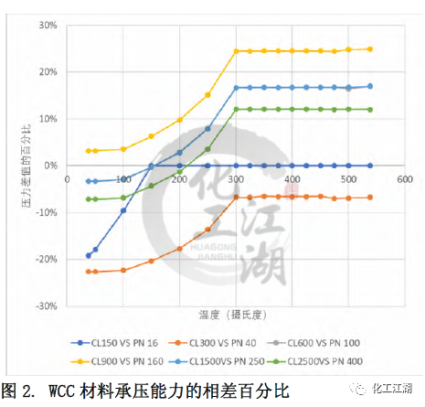 本文采用了對比冷(常溫)工作壓的方法來近似推算出與ASME標(biāo)準(zhǔn)Class壓力等級最鄰近的EN標(biāo)準(zhǔn)PN壓力等級。EN12516-1標(biāo)準(zhǔn)中列出的所有材料的冷工作壓都是相同的。而ASME B16.34標(biāo)準(zhǔn)中列出的冷工作壓和材料相關(guān),故選取了其中一種較強(qiáng)材料(C12A)的冷工作壓用于對比。 通過對比得到每個ASME標(biāo)準(zhǔn) Class壓力等級對應(yīng)的最鄰近的EN標(biāo)準(zhǔn) PN壓力等級,見表1。同時,這樣的對應(yīng)關(guān)系也和閥門設(shè)計(jì)的通用做法一致。本文的管道內(nèi)徑,最小壁厚,材料承壓能力的對比都是依照表1中的對應(yīng)關(guān)系來進(jìn)行的。 1.2 材質(zhì)承壓能力的對比 無論是ASME標(biāo)準(zhǔn)還是EN標(biāo)準(zhǔn)都列出了一些ASTM標(biāo)準(zhǔn)材料的壓力溫度等級,即材料在不同溫度下的承壓能力。本文選取了常見的閥體材料:碳鋼WCC,合金鋼 WC9和C12A進(jìn)行研究,來對比兩個標(biāo)準(zhǔn)中相同材料在標(biāo)準(zhǔn)壓力等級下的承壓能力的差別。 圖1和圖 2顯示了WCC材料的溫度壓力曲線和Class與PN的對比,可以看出: (1)對于ASME的 Class 150和EN12516-1 的PN16,當(dāng)溫度低于150攝氏度時,EN標(biāo)準(zhǔn)規(guī)定的材料承壓能力低于ASME標(biāo)準(zhǔn)規(guī)定的材料承壓能力,且隨著溫度升高,差距逐漸縮小。當(dāng)溫度高于150攝氏度時,兩個標(biāo)準(zhǔn)對相同材料的承壓能力的規(guī)定近乎相同。 (2)對于ASME的 Class 300和EN12516-1 的PN40,在整個溫度的范圍內(nèi),EN標(biāo)準(zhǔn)規(guī)定的材料承壓能力均低于ASME標(biāo)準(zhǔn)規(guī)定的材料承壓能力。當(dāng)溫度低于300攝氏度時,隨著溫度升高,差距逐漸縮小。當(dāng)溫度高于300攝氏度時,兩個標(biāo)準(zhǔn)對相同材料的承壓能力的規(guī)定差別趨于一致,約為-7%。 (3)對于ASME的 Class 900和EN12516-1 的PN160, 在整個溫度的范圍內(nèi),EN標(biāo)準(zhǔn)規(guī)定的材料承壓能力均高于ASME標(biāo)準(zhǔn)規(guī)定的材料承壓能力。當(dāng)溫度低于300攝氏度時,隨著溫度升高,差距越來越大。當(dāng)溫度高于300攝氏度時,兩個標(biāo)準(zhǔn)對相同材料的承壓能力的規(guī)定差別趨于一致,約為24%。 (4)還有一點(diǎn)值得注意的,除了PN16,其他PN壓力等級對應(yīng)的工作壓力在低于300攝氏度以下都是一樣的,而ASME等級對應(yīng)的工作壓力是隨著溫度升高持續(xù)下降的。 1.3 對閥體設(shè)計(jì)的指導(dǎo) 在實(shí)際設(shè)計(jì)過程中,無論是為了縮短新產(chǎn)品推向市場的時間,還是從產(chǎn)品標(biāo)準(zhǔn)化、成本優(yōu)化的角度去考慮,盡可能多地將已有的設(shè)計(jì)或者零部件(尤其是需要開發(fā)鑄造模具的閥體)應(yīng)用到新的產(chǎn)品中,都是設(shè)計(jì)師不可避免要考慮的問題,可以采用同一個閥體鑄件的設(shè)計(jì)來滿足ASME 標(biāo)準(zhǔn)和EN標(biāo)準(zhǔn)的要求呢?為了解答這個問題,本文選取了三個不同壓力等級-低、中、高的十二個具體實(shí)例,各項(xiàng)參數(shù)的對比結(jié)果如表3 所示。 (1)低壓ASME Class 300與 EN PN40 從表3中差別的百分?jǐn)?shù)可以看出,在兩個尺寸下,滿足ASME標(biāo)準(zhǔn)和EN 標(biāo)準(zhǔn)的管道內(nèi)徑和最小壁厚的差別,均小于5%。就是說,用同一個閥體設(shè)計(jì)來滿足兩個標(biāo)準(zhǔn)的設(shè)計(jì)要求是可以接受的。同時從圖2中可以看出,閥體常見材料在這兩個等級的承壓能力差別也較小,10%以內(nèi)。因此,兩個設(shè)計(jì)可以在類似的實(shí)際工況中應(yīng)用。 (2)中壓ASME Class 900與 EN PN160 對于中壓下尺寸為DN100和DN200的兩組設(shè)計(jì),從差別的百分?jǐn)?shù)可以看出,雖然每組中要對比的兩個設(shè)計(jì)的管道內(nèi)徑非常接近,但是所要求的最小壁厚卻相差較多,超過了20%。在這種情況下,實(shí)踐中也是可以用同一個閥體設(shè)計(jì)來滿足兩個標(biāo)準(zhǔn)的設(shè)計(jì)要求的,但是需要評估由此帶來的對最小壁厚要求較小的閥體的成本的影響。另一方面,從圖2中可以看出,閥體常見材料在這兩個等級的承壓能力差別較大,在有些溫度下差別達(dá)到20%。這種材料承壓能力上的差別和最小壁厚的差別是一致的。 (3)高壓ASME Class 2500與EN PN400 對于高壓下尺寸為DN100和DN200,閥門的管道內(nèi)徑和最小壁厚存在著巨大差別,30%-50%,故采用同一個閥體設(shè)計(jì)來滿足兩個標(biāo)準(zhǔn)的設(shè)計(jì)要求是不合理的。 還有另外一個因素需要在閥體設(shè)計(jì)時考慮,那就是閥體兩個端口之間的長度。ASME B16.34中指出可以按照ASME B16.10來確定端口對端口尺寸。EN12516-1 并未提及端口對端口尺寸,但歐標(biāo)體系中EN558規(guī)定了端口對端口的尺寸??紤]到端口對端口尺寸并非標(biāo)準(zhǔn)強(qiáng)制要求,故本文未提供ASME B16.10和EN558的區(qū)別。 (1)管道內(nèi)徑 ASME標(biāo)準(zhǔn)和EN標(biāo)準(zhǔn)在管道內(nèi)徑的主要差別在于管道內(nèi)徑是否隨著壓力等級的變化而變化。閥體設(shè)計(jì)時,管道內(nèi)徑的差異會進(jìn)一步放大閥門最小壁厚的差異。 (2)最小壁厚 兩個標(biāo)準(zhǔn)在閥門最小壁厚上的差異與壓力等級有關(guān),差別大致在6%到 26%之間。 (3)材料承壓能力 本文所研究的五種材料在兩個標(biāo)準(zhǔn)相鄰壓力等級間的對比趨