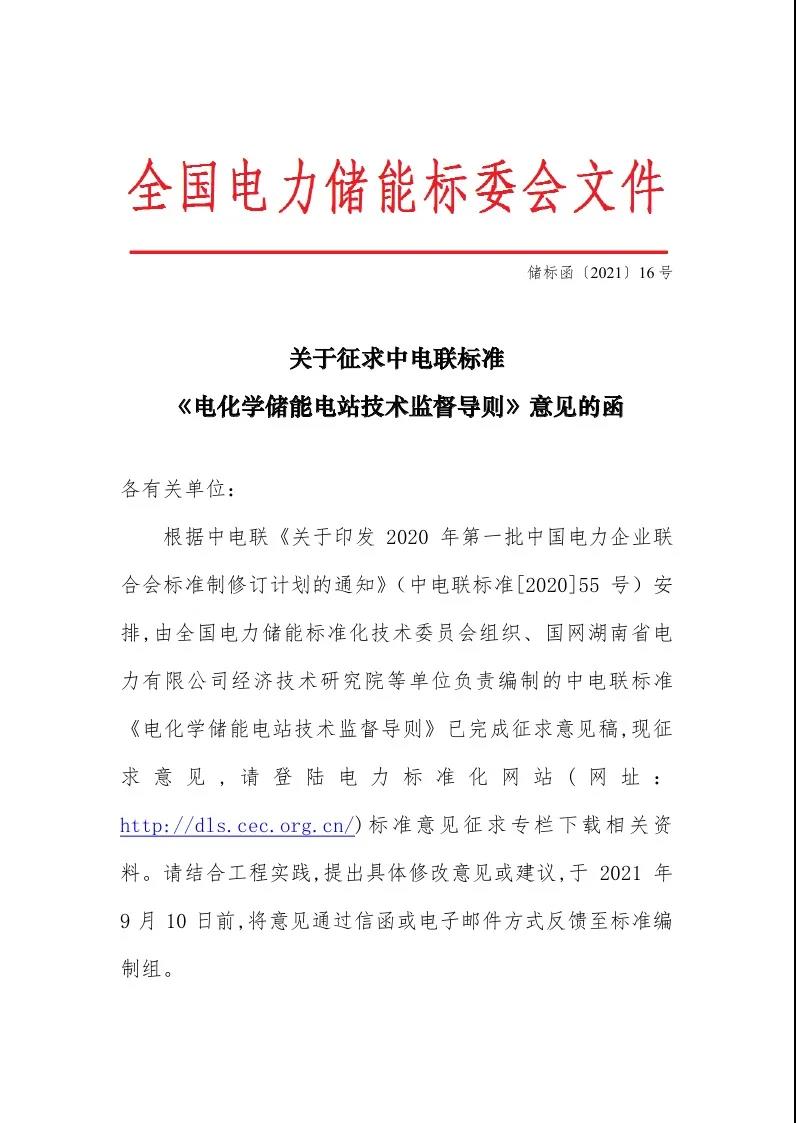 征求意見:關(guān)于征求中電聯(lián)標(biāo)準(zhǔn)《電化學(xué)儲能電站技術(shù)監(jiān)督導(dǎo)則》意見的函