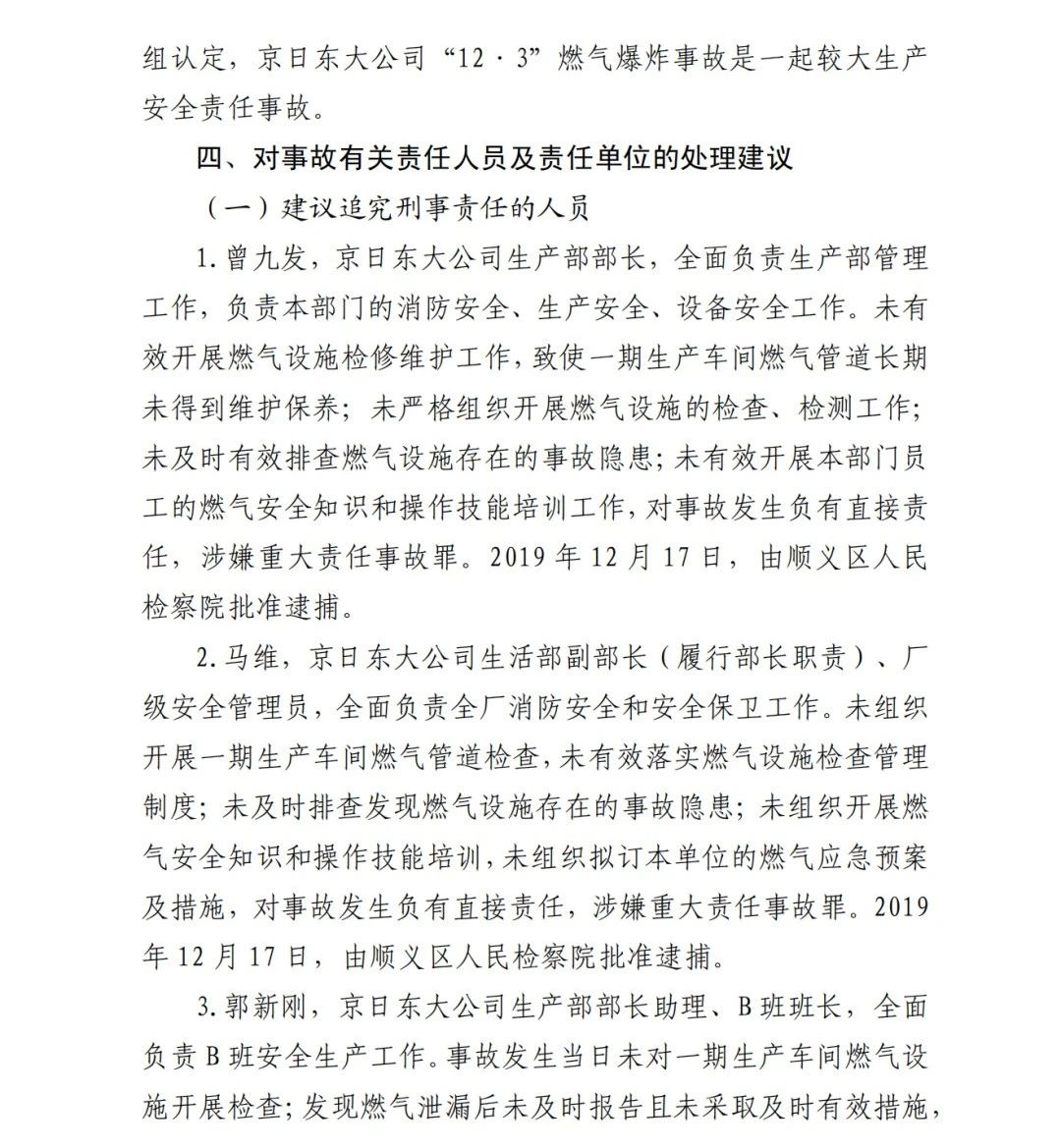 2.馬維,京日東大公司生活部副部長(履行部長職責)、廠級安全管理員,全面負責全廠消防安全和安全保衛(wèi)工作。未組織開展一期生產(chǎn)車間燃氣管道檢查,未有效落實燃氣設施檢查管理制度;未及時排查發(fā)現(xiàn)燃氣設施存在的事故隱患;未組織開展燃氣安全知識和操作技能培訓,未組織擬訂本單位的燃氣應急預案及措施,對事故發(fā)生負有直接責任,涉嫌重大責任事故罪。2019 年 12 月 17 日,由順義區(qū)人民檢察院批準逮捕。