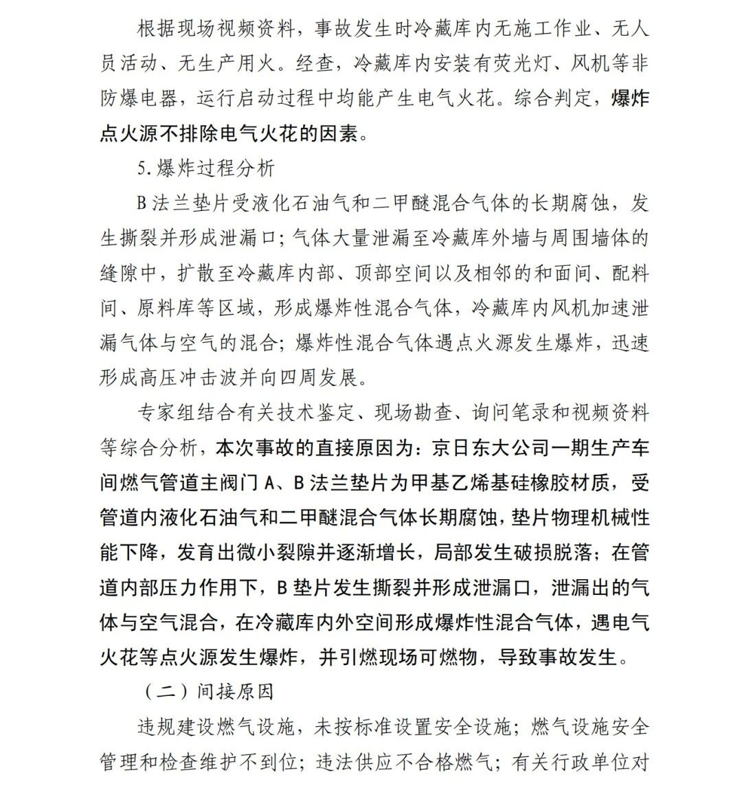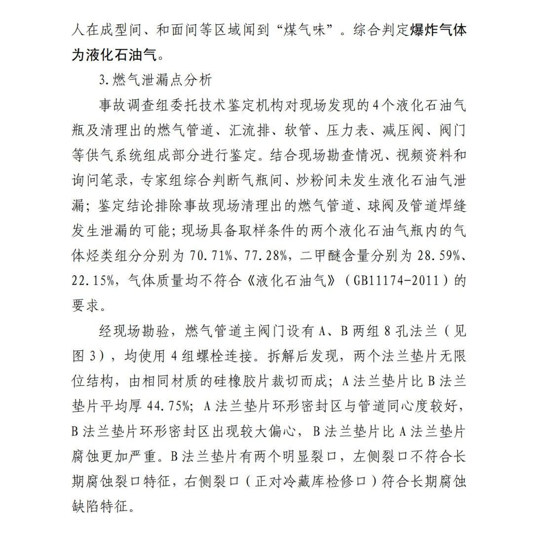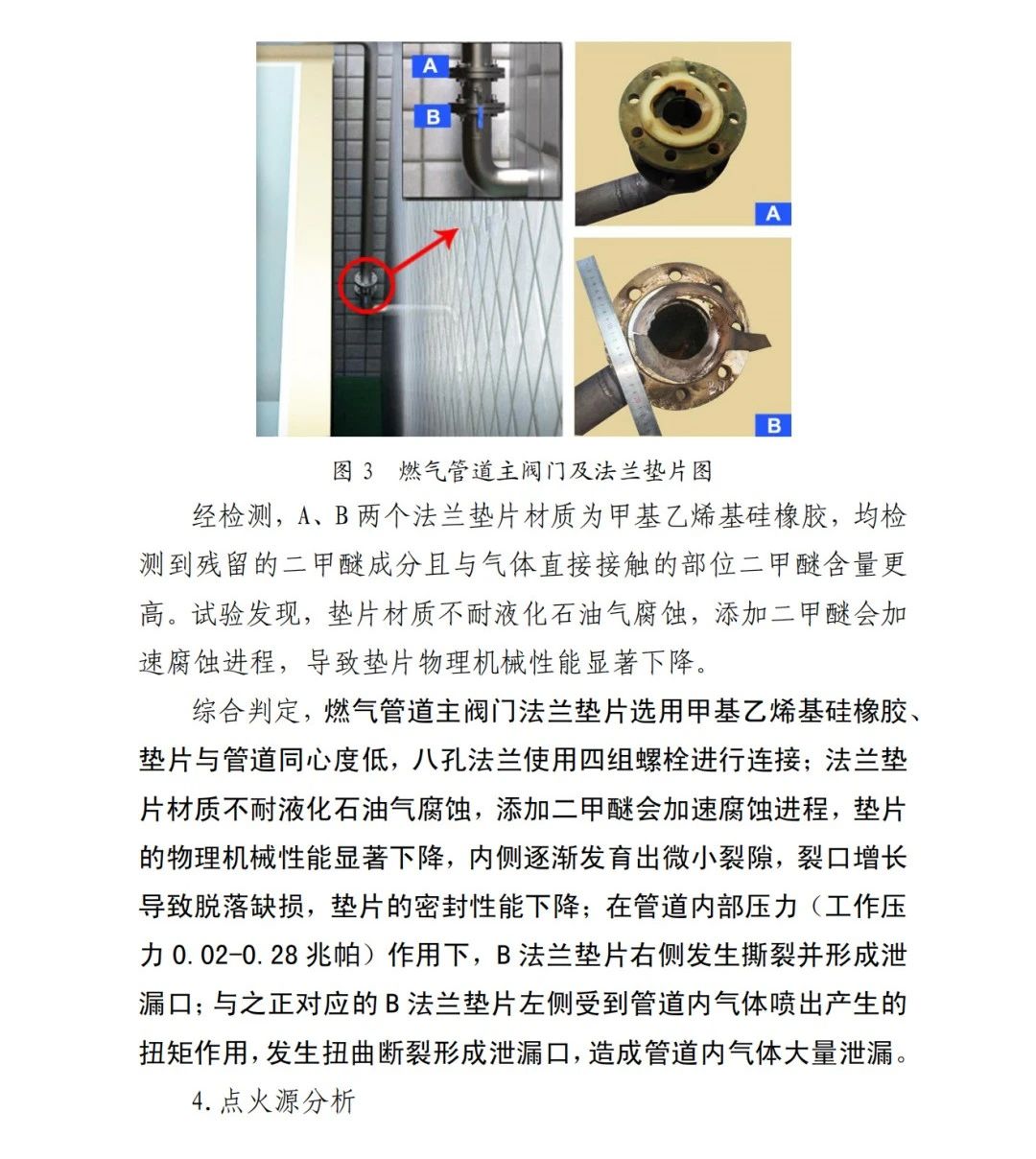本次事故的直接原因為:京日東大公司一期生產(chǎn)車間燃氣管道主閥門A、B法蘭墊片為甲基乙烯基硅橡膠材質,受管道內(nèi)液化石油氣和二甲醚混合氣體長期腐蝕,墊片物理機械性能下降,發(fā)育出微小裂隙并逐漸增長,局部發(fā)生破損脫落;在管道內(nèi)部壓力作用下,B墊片發(fā)生撕裂并形成泄漏口,泄漏出的氣體與空氣混合,在冷藏庫內(nèi)外空間形成爆炸性混合氣體,遇電氣火花等點火源發(fā)生爆炸,并引燃現(xiàn)場可燃物,導致事故發(fā)生。