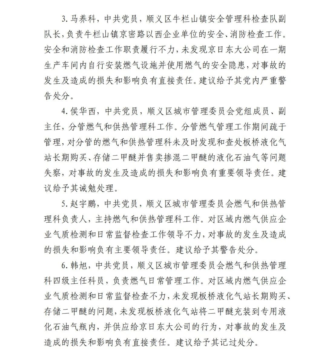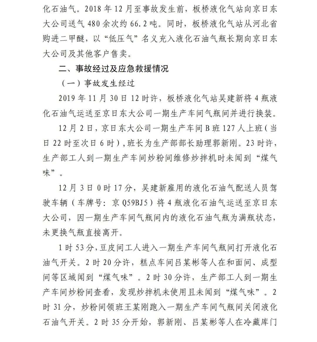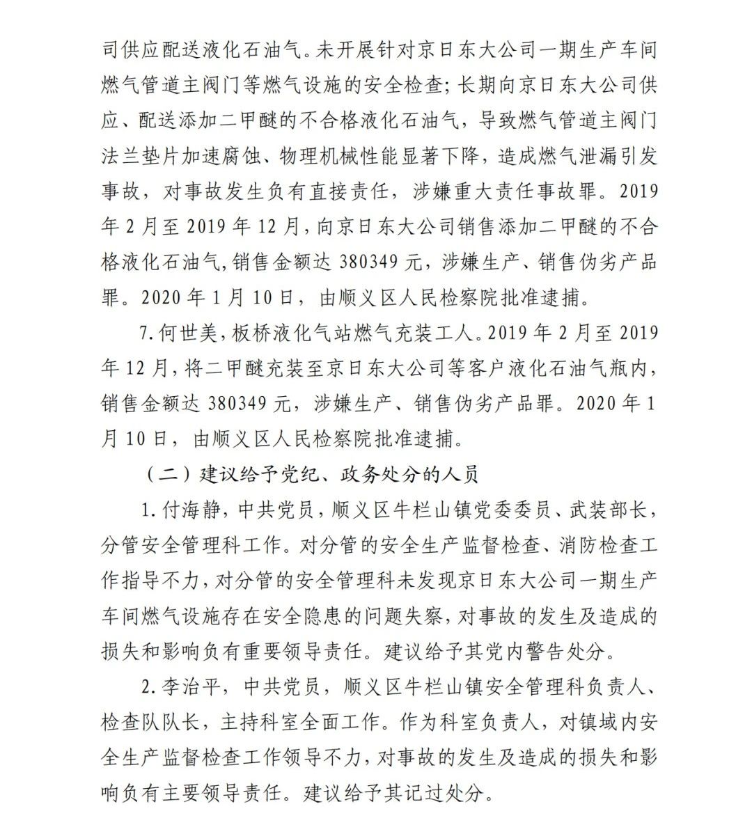 6.吳建新,板橋液化氣站工作人員,具體負責向京日東大公15司供應配送液化石油氣。未開展針對京日東大公司一期生產(chǎn)車間燃氣管道主閥門等燃氣設施的安全檢查;長期向京日東大公司供應、配送添加二甲醚的不合格液化石油氣,導致燃氣管道主閥門法蘭墊片加速腐蝕、物理機械性能顯著下降,造成燃氣泄漏引發(fā) 事故,對事故發(fā)生負有直接責任,涉嫌重大責任事故罪。2019 年 2 月至 2019 年 12 月,向京日東大公司銷售添加二甲醚的不合 格液化石油氣,銷售金額達 380349 元,涉嫌生產(chǎn)、銷售偽劣產(chǎn)品 罪。2020 年 1 月 10 日,由順義區(qū)人民檢察院批準逮捕。
