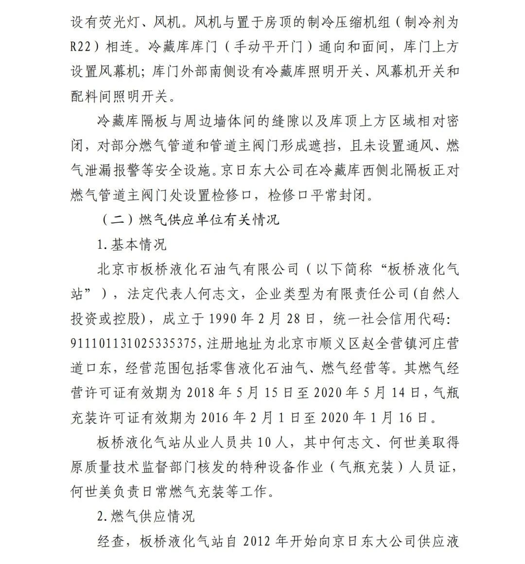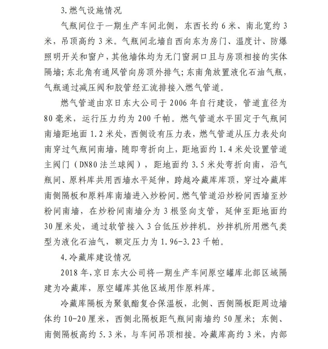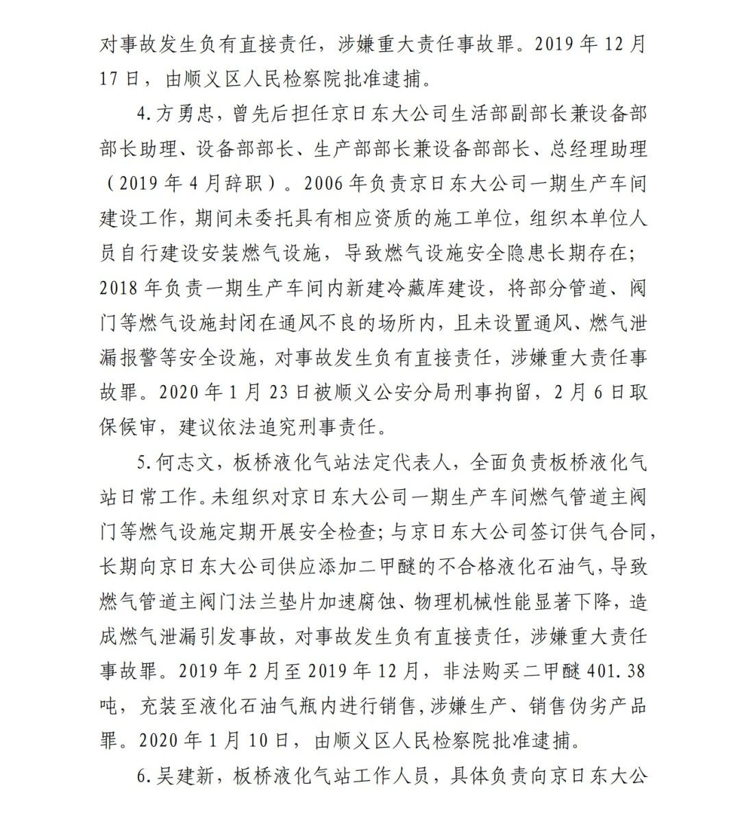 4.方勇忠,曾先后擔任京日東大公司生活部副部長兼設備部部長助理、設備部部長、生產(chǎn)部部長兼設備部部長、總經(jīng)理助理(2019年4月辭職)。2006年負責京日東大公司一期生產(chǎn)車間建設工作,期間未委托具有相應資質的施工單位,組織本單位人員自行建設安裝燃氣設施,導致燃氣設施安全隱患長期存在;2018 年負責一期生產(chǎn)車間內(nèi)新建冷藏庫建設,將部分管道、閥門等燃氣設施封閉在通風不良的場所內(nèi),且未設置通風、燃氣泄漏報警等安全設施,對事故發(fā)生負有直接責任,涉嫌重大責任事 故罪。2020 年 1 月 23 日被順義公安分局刑事拘留,2 月 6 日取 保候審,建議依法追究刑事責任。