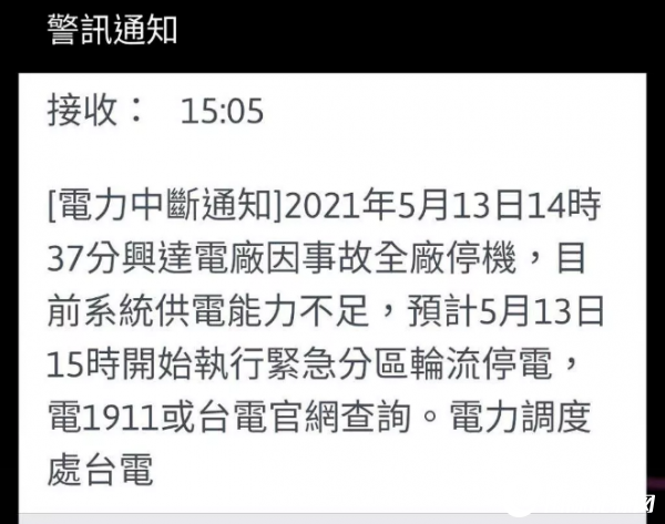 據(jù)報(bào)道,高雄市今天下午近3時(shí),多個(gè)行政區(qū)出現(xiàn)大停電現(xiàn)象,網(wǎng)友抱怨今天天氣30多度,冷氣停電熱到爆。稍早媒體收到“警訊通知”短信,上面寫著“5月13日14時(shí)37分興達(dá)電廠因事故全廠停機(jī),目前系統(tǒng)供電能力不足,預(yù)計(jì)5月13日15時(shí)開始執(zhí)行緊急分區(qū)輪流停電”。臺(tái)電高雄區(qū)處則說,目前正在了解厘清。