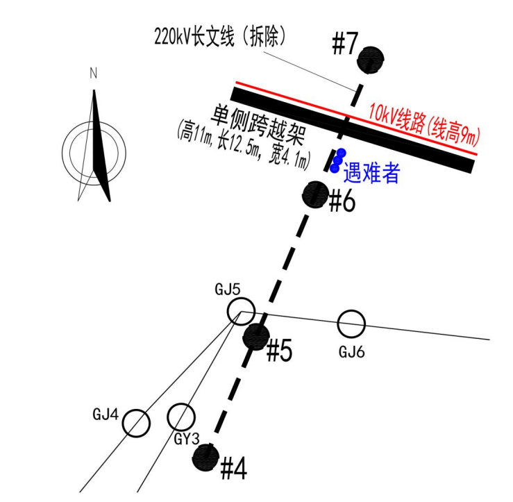 2023 年5月8日,施工項(xiàng)目部安排施工人員在原 220 千伏長文線 6-7 號桿塔間進(jìn)行10千伏夏屯線跨越架搭設(shè),因民事阻工僅在事故發(fā)生處南側(cè)搭設(shè)了單側(cè)跨越架。