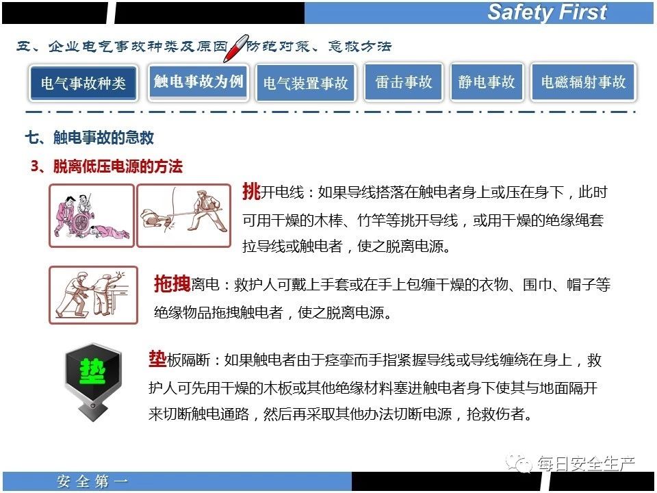如果是低壓電源觸電,實施“五字”脫離電源法: