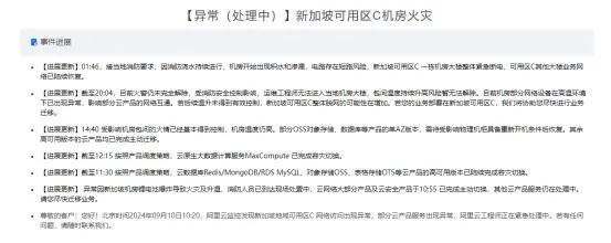 火災(zāi)公告顯示,11日凌晨01:46,接當(dāng)?shù)叵酪螅蛳罎菜掷m(xù)進(jìn)行,機(jī)房開始出現(xiàn)積水和滲漏,電路存在短路風(fēng)險(xiǎn),新加坡可用區(qū)C一棟機(jī)房大樓整體緊急斷電,可用區(qū)C其他大樓業(yè)務(wù)網(wǎng)絡(luò)已陸續(xù)恢復(fù)。